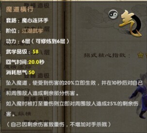 这一招的主要作用是用来吸收伤害,哈哈,貌似这是句废话。我主要是用它吸收自己魔气的伤害,因为魔心一旦打起来,大多数时候都会把对方带入自己 的节奏,基本就跟打NPC一样吊着打(高玩别吐槽我这句话)。所以开魔道是为了吸收自己魔气的伤害,然后结束时就把本来该自己承担的那部分伤害弹给了对 方,让他雪上加霜。当然,另一种情况也是很爽,就是对方一个高段数高伤害大招打在了你的魔道上,我曾经就在四内时候开魔道被酒雨丐帮一个巴掌大招抽脸上 了,然后、、、他被弹死了。