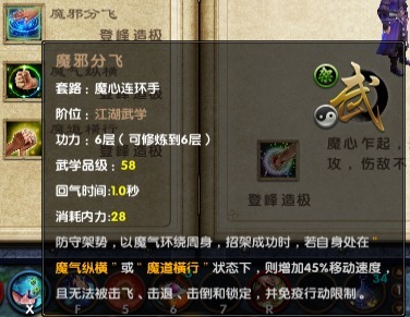 魔气的第一个亮点,减速禁轻 功,这是强迫对方和你在魔气中对打的关键之处也是胜利之本,同样也是对方破解魔心连环手的突破口,破解方法在后面会继续说。开了魔气就是不能让对方跑,要 注意魔气的圈,时刻让对方保持在这个范围内,他无法使用轻功就只能走出去,所以你要注意控制自己魔随空生和魔极屠情的CD,如果他扛不住肯定是要走出去 的,这样你一个魔随空生拉回来就又是一套,如果他不走,那更好了,魔气的第二个亮点就在这里。