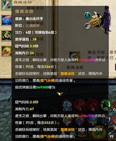 魔心的其他几个实招我就放到一起说了,看上面的图大家就知道了,魔随时外功伤害,而魔极屠情这个冲锋则是内功伤害,魔踏七星主要是用来补伤害 的,在对方倒地或者自己有五秒伪霸体时候可以释放。那么问题就来了,究竟是带内功宝物还是外功宝物,还是双爆宝物?下面会在宝物里说。