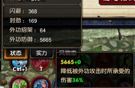 这是我下山后的渣渣属性,大家不要见笑,主要想让大家看的是外防5665的效果,降低被外功攻击时所承受伤害的百分之36,算一个简单的数学 题,也就是说原来只打出了百分之64的伤害,而破防后打出了百分之百的伤害,这样,其实伤害在破防后变为了原来的百分之156.25,整整高了一半多,再 加上附加的阴伤害,就是百分之164.25,而破防后魔气伤害也会增加,这就是成吨的伤害的来源。注意破防,这对玩魔心很关键,好的破防可以杀死对手。