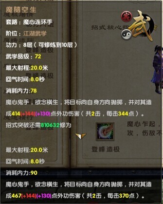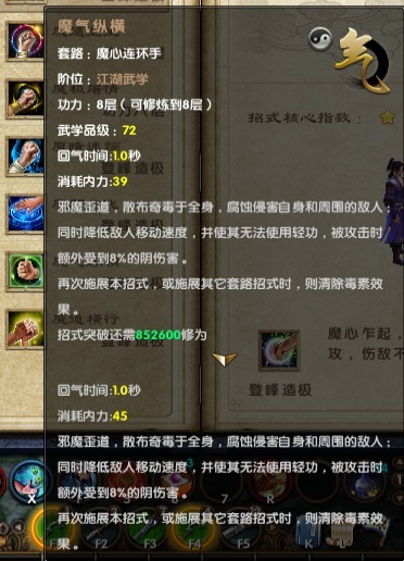 然后,我要说一下魔气掉血的问题,魔气掉血的多少取决于你的内功威力(不计算宝物的情况下约等于内息),你内息高,掉血就多,对方掉血也多,但 是我觉得这个不合适,不划算,如果对方开揽雀尾,你就必须关魔气了,人家再天马,你的血跟他互拼就有可能跟不上了,当然这点我要提一下,开天马赶紧抓时机 魔随空生拉回来开魔气又能揍一套。