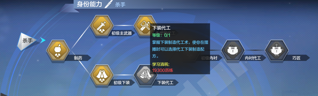 我这里选择的是杀手,还有其他的身份。可以预览每个身份的能力,每个身份可以制作2个部位的装备,想做什么装备就选择哪个。