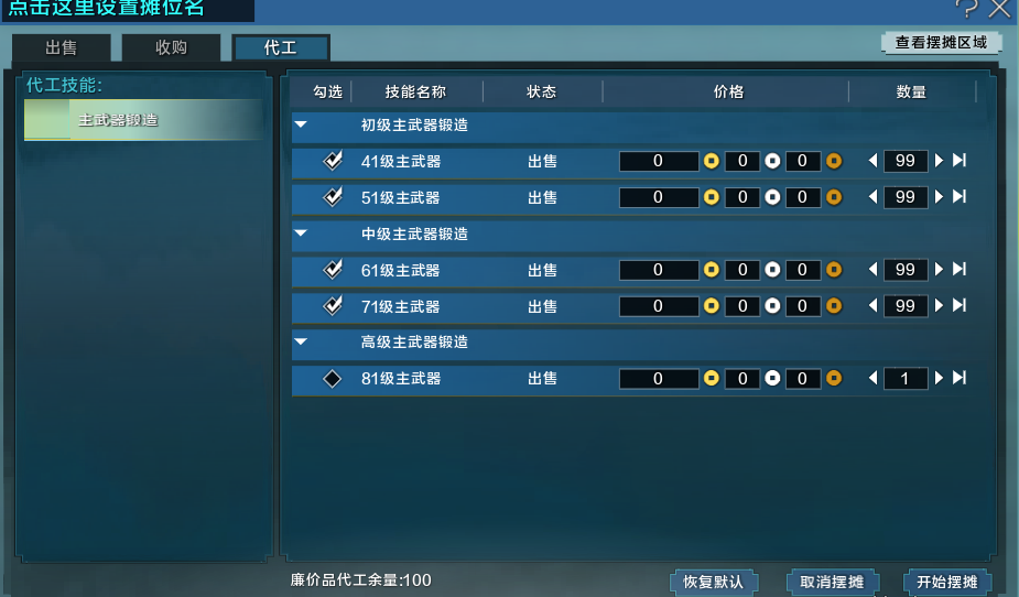如上文所说,代工就是摆摊,其他人在你的摊位制作装备,你可以收取手续费。收取多少自己决定。我建议初期免费代工,可以提升熟练度!