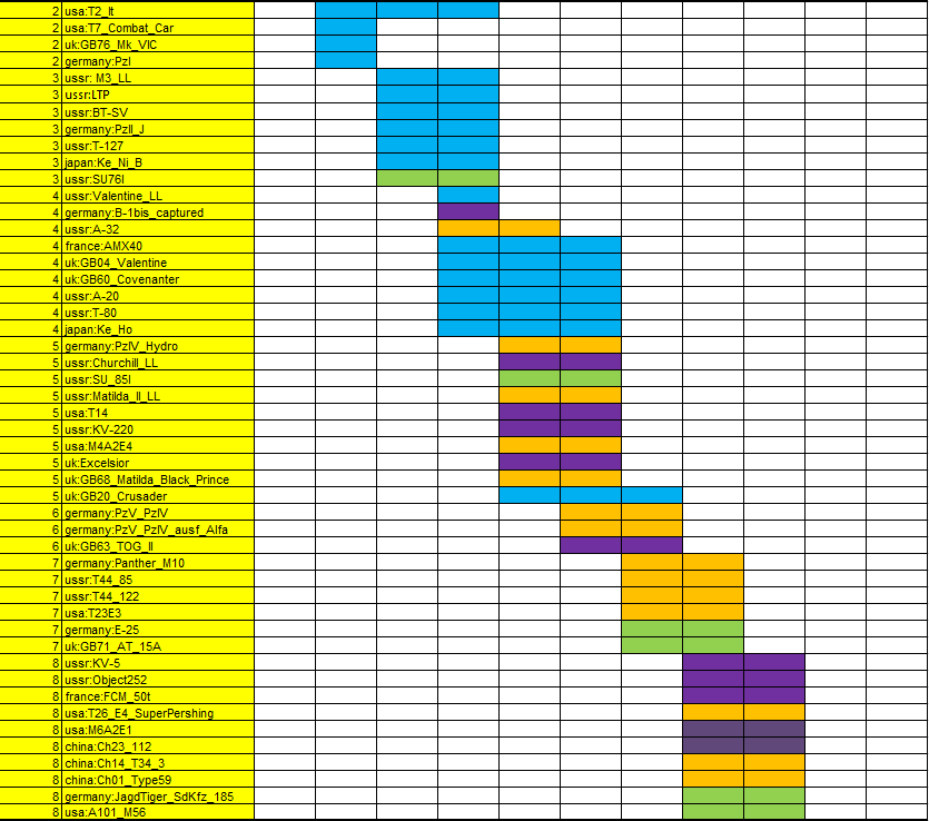 现版本战场等级总共11级,官方图表显示了各辆战车属于哪些战场等级。英文版的表格在版本升级时有可能会有些延迟,而俄文版的更新总是快得多,本文引用了俄服官网最新版的图表。(LT蓝色、MT橙色、HT紫色、SPG红色、TD绿色)