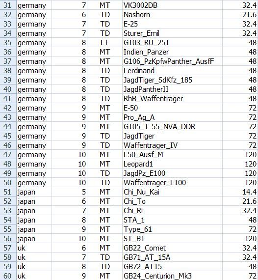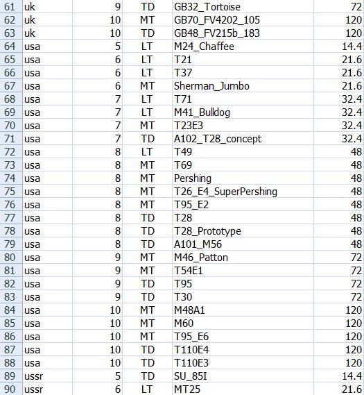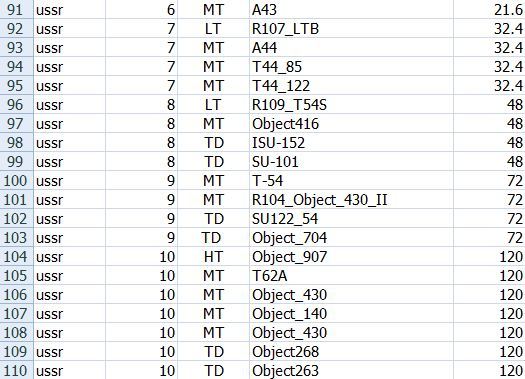 以下Excel截图为0.9.4版本109辆特殊权重坦克