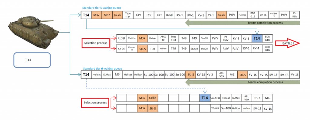 SPG车辆总是最先加入队列。在那之后,“MM”将开始寻找坦克,以填补剩下的空位。高权重车(顶级车)在火炮之后加入队列。