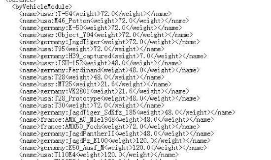 权重信息作为游戏的隐藏数值参数不能从面板直接查看,它与车辆类型、等级以及在战斗中的作用(由白毛子判断)相关。可以通过一个小工具解析本地文件Vehicle.xml获取当前版本的车辆权重信息。文件部分内容如下图。