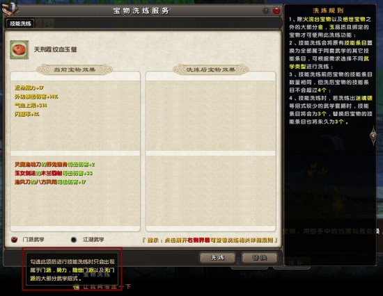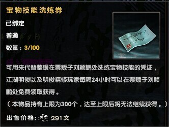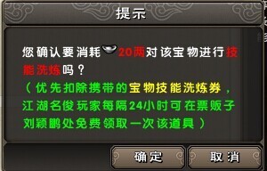 1.新增宝物招式洗炼功能:普通宝物在“刘颖鹏”处洗炼,火浣台宝物在“钱富贵”处洗炼,江湖名俊玩家每日可在票贩子“刘颖鹏”处领取免费洗练卷3张、名俊精修玩家再额外获得2张。