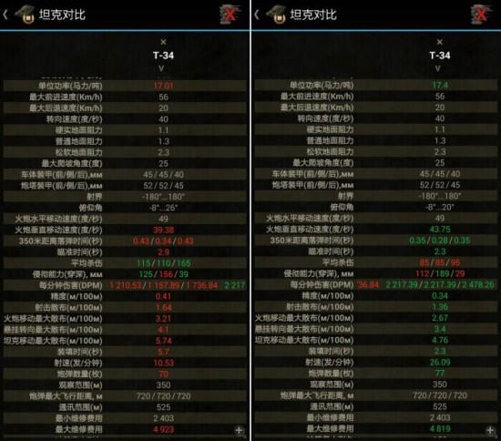 T-34所处分房为低级向中级进阶的环境,且正是培养包抄绕后意识的时间。所以,穿深不是那么重要,伤害也不是那么重要;重要的是,T-34这 车的机动,以及T-34经常遇到敌人的装甲并不高,在低级房中需要的是精度和射速的配合。这个实例告诉我们:不要光看纸面数据,只有实际的体验,才能找到 真正适合这辆战车定位的主炮。如果说不了解一些隐藏数据,可以通过下面我给的链接用手机下载一个数据库,可以提前进行对比,也可以了解是否不更换悬挂就能 更换炮塔和主炮。