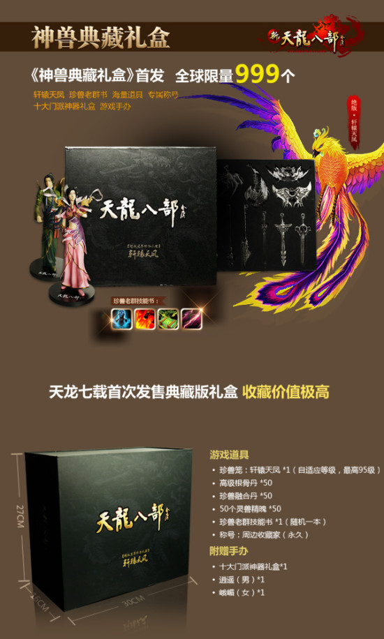 今年双十二,让上古神兽带你飞!《新天龙八部》2014年末巨献——神兽典藏礼盒今日12:00首发上市,拥有极限资质、绝美身姿的珍兽【轩辕天凤】将携珍兽豪礼、门派神器礼盒、绝版手办及永久称号现身天龙江湖,助阵十一大门派征战四方。作为获取轩辕天凤的唯一渠道,礼盒全球仅限量999套,售卖完毕后,天凤即会加入绝版珍兽行列。