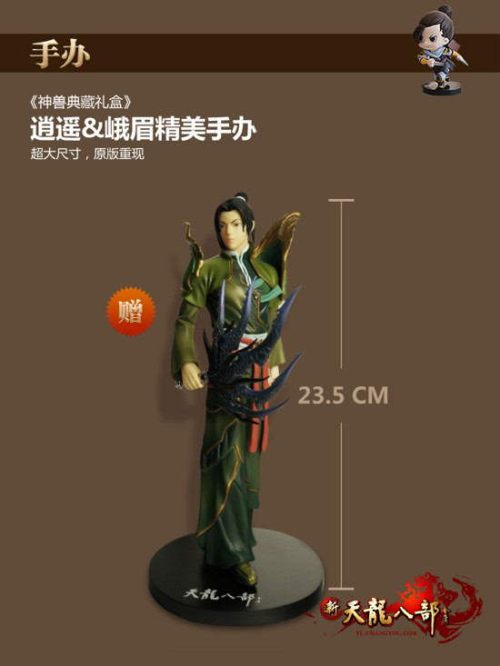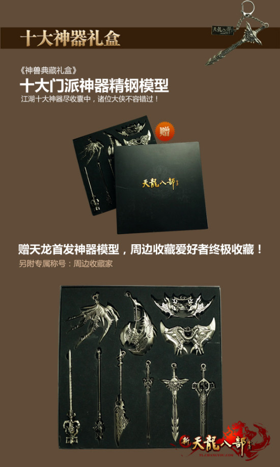 作为多年的忠实玩家,身边怎能没有实体周边,随时随地做好与其他小伙伴认亲的准备?2014版神兽典藏礼盒中,还藏有已绝版的精美峨嵋、逍遥角色手办, 以及真实比例还原,精心雕琢细节的十大门派神器模型礼盒。低调华丽的金属质感,纤毫毕现的装饰纹样,配合便于随身携带的袖珍尺寸,以及极具设计感的豪华包 装,无疑是天龙周边收藏上上之选。