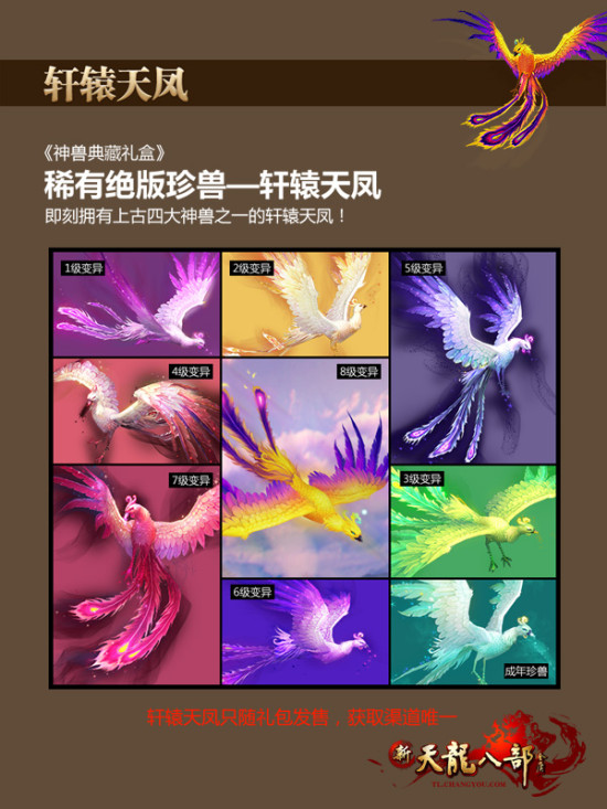 轩辕天凤为拥有极限资质的灵气内攻型珍兽,截止目前全球仅有数只,是天龙江湖中超级稀有珍兽之一,江湖中拥有它的大侠屈指可数,每当有大侠繁育二代轩辕天凤,甚至会引得江湖人士争相围观。满足更多玩家对神兽的渴望,本次发售的神兽典藏礼盒中将包含一对【轩辕天凤】宝宝,当然,数量仍然极为稀少,全球仅限999对!