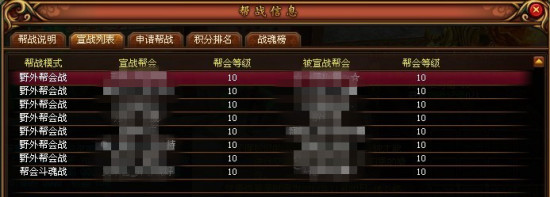 宣战列表中显示宣战帮会名称、被宣战帮会名称、帮会等级,排列按照申请时间排列,申请早的帮会排列靠前。