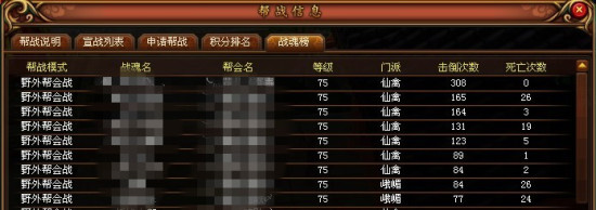 击倒排名可按照帮会进行详细查询