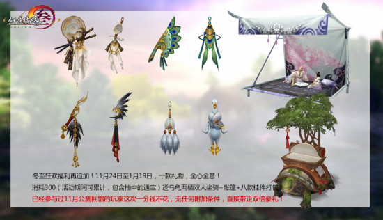 冬至狂欢节首周全场消费将有150%积分回馈,狂欢福利再翻倍:在2014年11月24日至1月19日期间,充消额度累计达到300元即可免费 领取八款精美挂件、双人帐篷和乌龟坐骑共计十重豪礼!今日追加的奇趣乌龟水路两栖还可双人同骑,陆上憨厚呆萌,水中加速暴走,诚邀侠士结伴共赏美景!新挂 件“喙朝天”、“黑羽千华”以羽翼为主题,精致华贵;“应有骨 ”、“惊声尖叫”以皮草为主题,诙谐幽默。