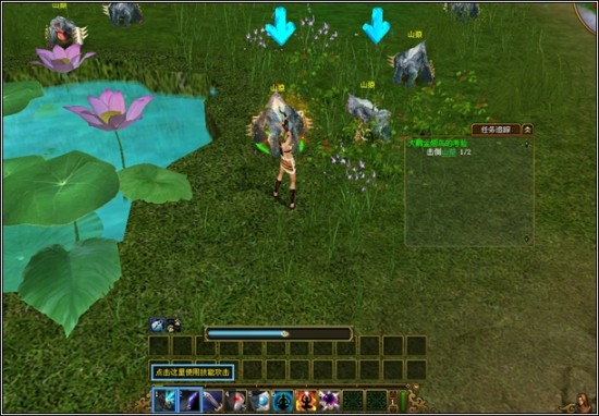 打怪:在游戏界面最下方的快捷键栏目,系统会提示您“鼠标左键(或用快捷键TAB)选中并锁定目标,按键盘数字1或用鼠标左键点击图标发动技能,另外,还可以直接用鼠标右键点击怪物来进行普通攻击