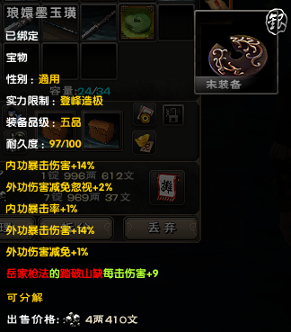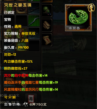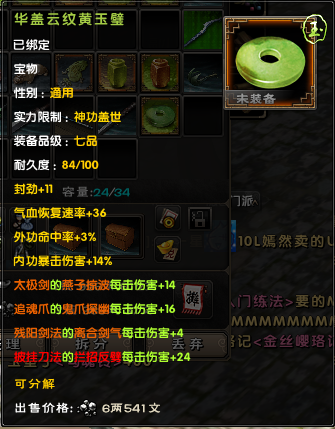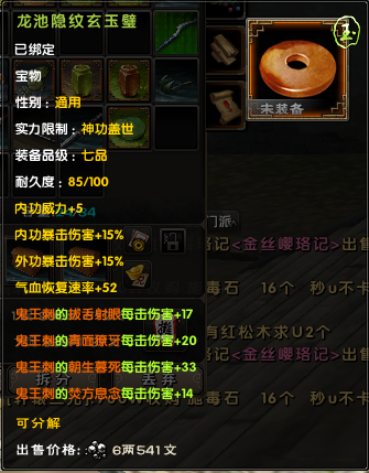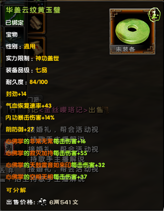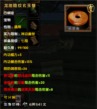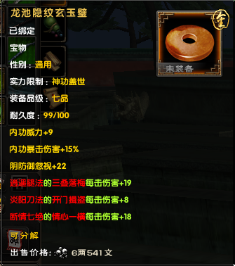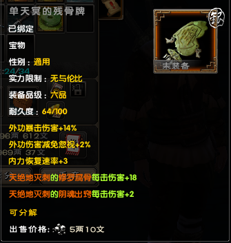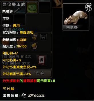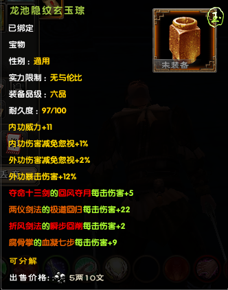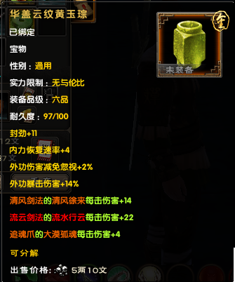 后期大家外防很容易上6000,以6000来算,对手减伤有37.5%,也就是你造成的伤害只有62.5%。带上一套这个宝物后,伤害变成72.5%,相当 于伤害增加了10%/62.5%=16%,16%的伤害增加,相当于你的外攻套路所有招式威力提升了一层半,是所有招式哦!