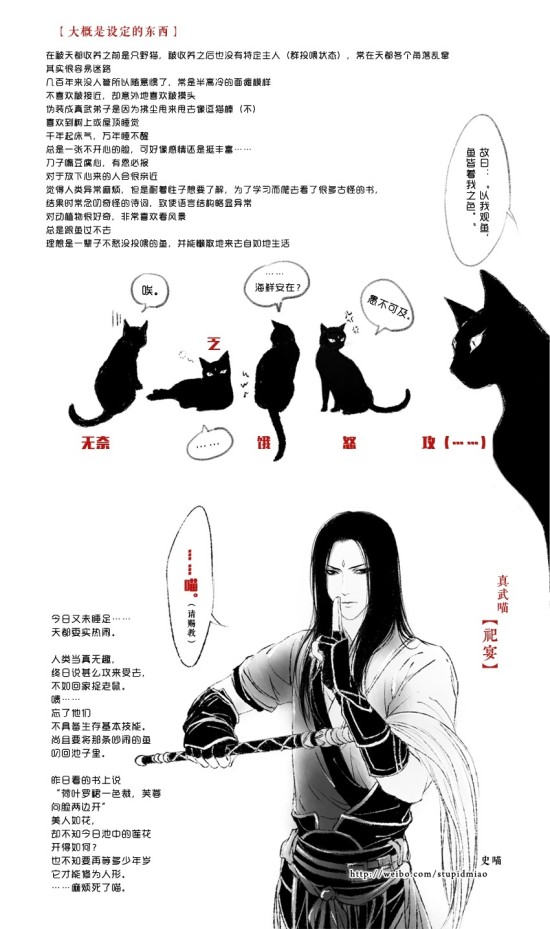 手绘黑猫拟人版真武道长设定 2015-02-26 11:20 新浪游戏 0 画的第一张天刀图是天都里的坑爹设定,终于把我的小真武涂了一涂,喵的设定加上待机的不高兴脸,再加上我说话的习惯,大概会变成这样吧……