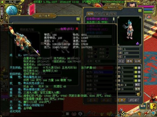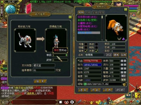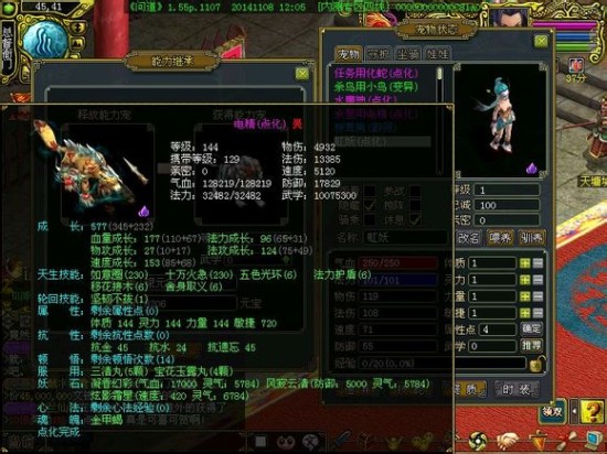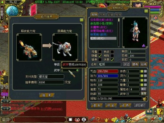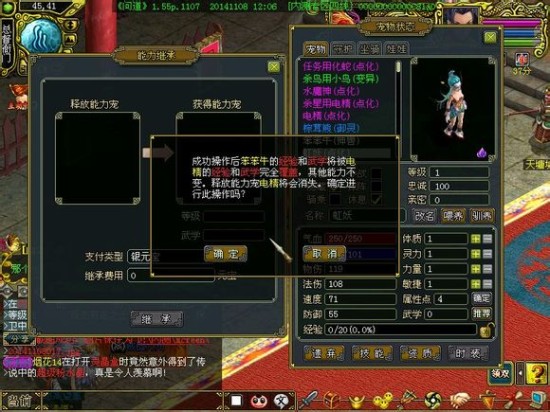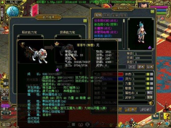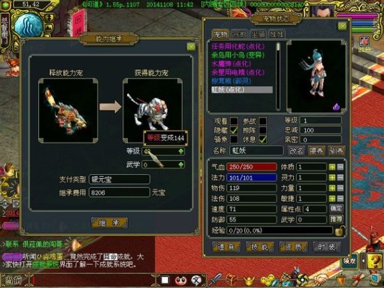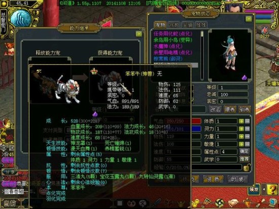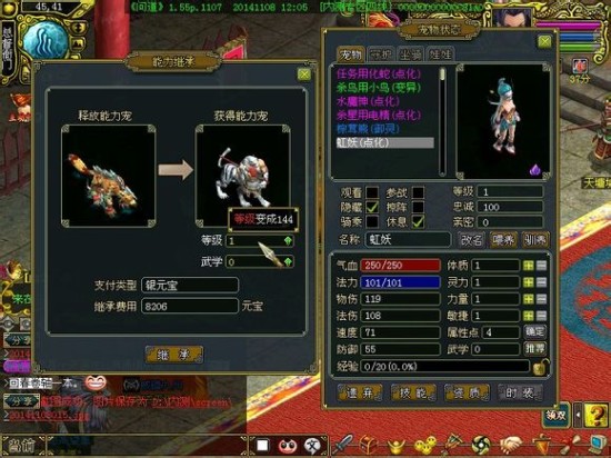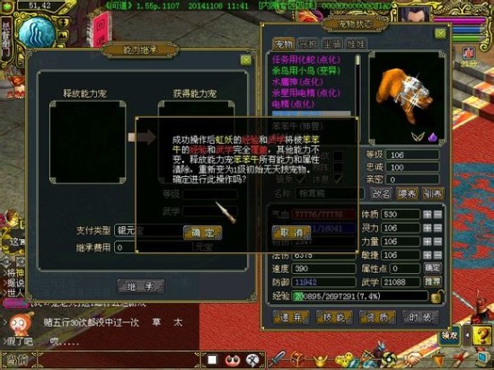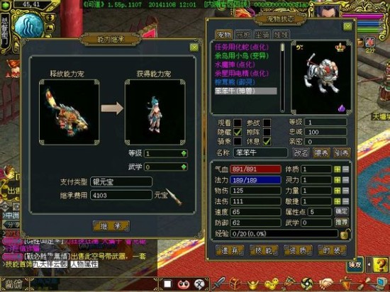 释放能力宠都是144级的电精,获得能力宠是1级的虹妖,需要4103元宝,换成笨笨牛就需要8206元宝,费用翻了一番。