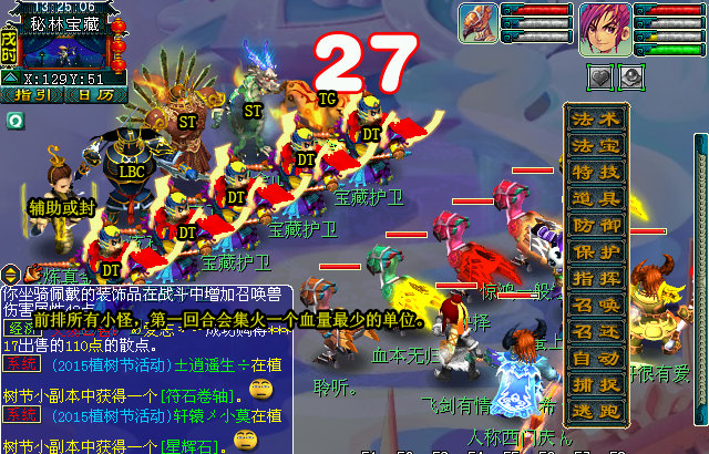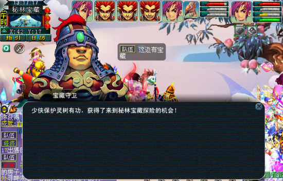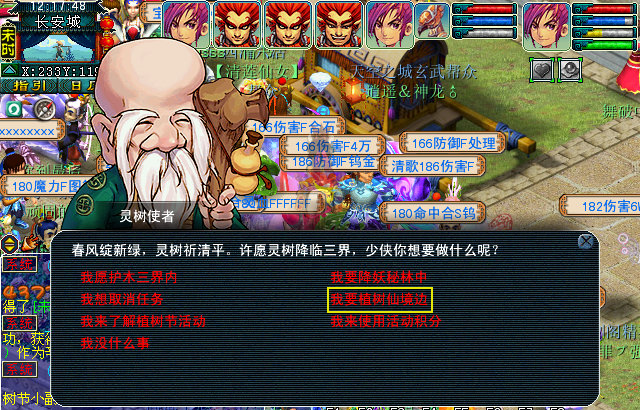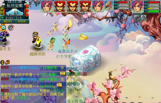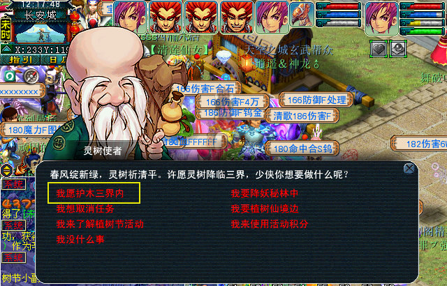 【玩法介绍】∶2015植树节活动期间,玩家(≥30,至少3人组队)可以在长安城(230,120)灵树使者处选择"我要护木三界内",即可领取组队环任务,按照提示完成任务,就可以获得丰厚的经验、金钱、物品以及积分奖励。10个小任务为一轮。