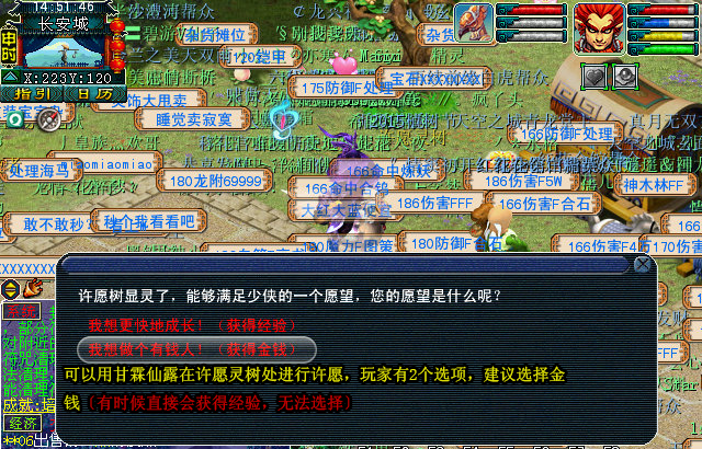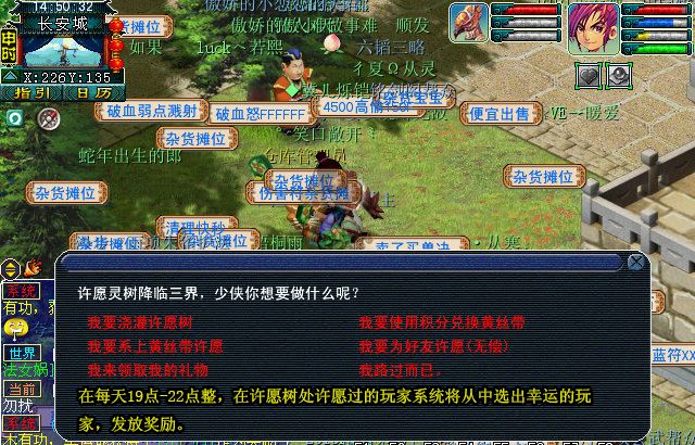 在每天19点-22点整,在许愿树处浇灌过树的玩家系统将从中选出幸运的玩家,发放奖励。