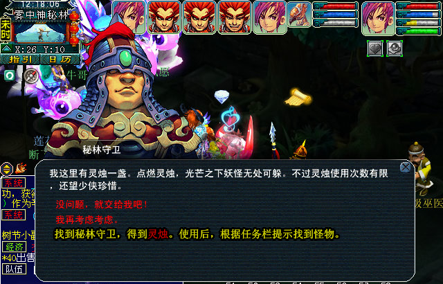 进入场景后,找到秘林守卫,得到灵烛。使用后,根据任务栏提示找到怪物。