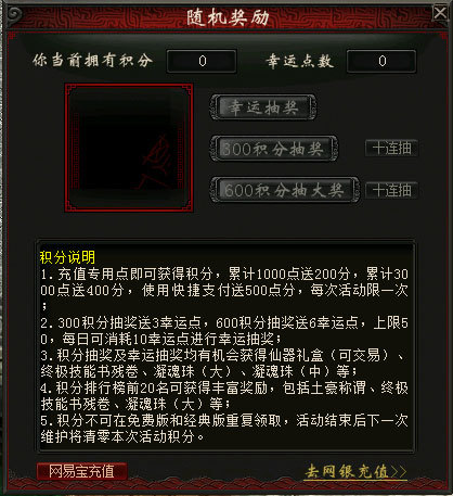 2、活动期间内可以进行幸运点数抽奖和积分抽奖,奖品包括仙器礼盒(可交易)、终极技能书残卷、凝魂珠(大)、凝魂珠(中);