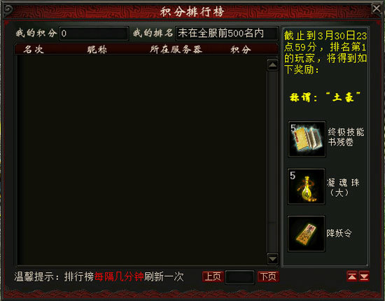 3、积分累计前20就能拿到“土豪”称谓。更可获得终极技能书残卷奖励!全服排名前三的玩家,还能额外得到凝魂珠(大)。