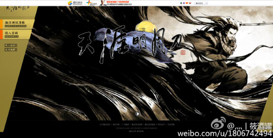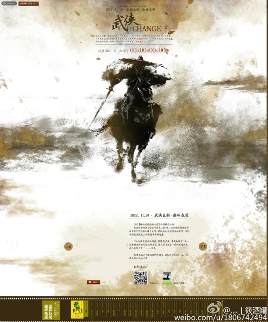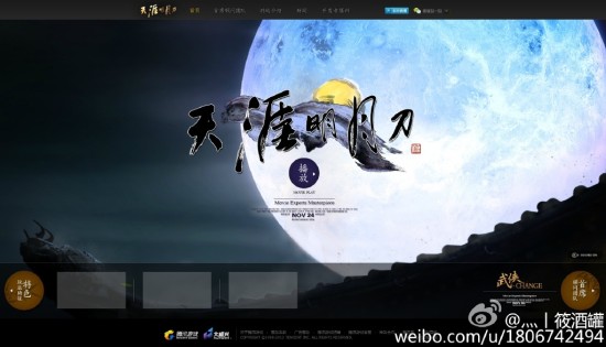 这应该是最早的天刀主页。你没有看错,主题只有两个字——武侠。进入首页,首先能看到一身着蓑笠的侠客于一匹水墨的马背上奔腾而来。同时想起了《东邪西毒》的背景,一种苍凉而又纯粹的武侠风扑面拂来。其下,为天刀最开的海报,以及从1927年以来的各项武侠电影介绍。