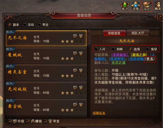| 伟大遗迹副本(70级可进) | [精灵圣堂]、[无尽之海]、[魔械城]、[黄沙古迹] |