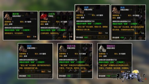 以上三种,可在商店购得,价格均为50金,骑乘后移动速度增加700。很明显速度将比之前有所增加,马身上的主要装饰由布料、皮革组成,略显豪气。