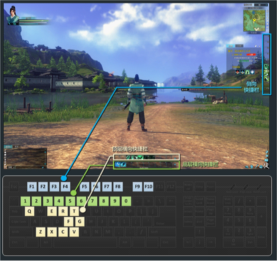 与F1~F10绑定的10个侧向快捷栏,可放置道具和技能,按下相应按键后快速使用。