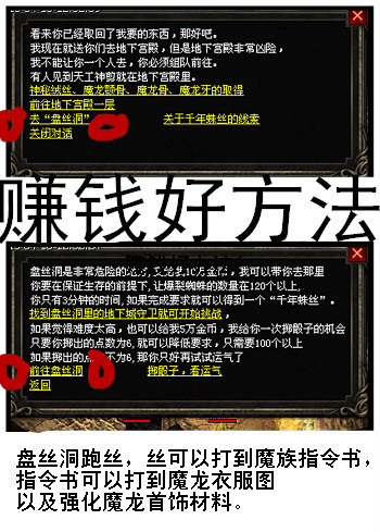 很多手法好的玩家,很会在游戏里面赚钱弄装备以及技能书,可以自己去地下宫殿的盘丝洞进入跑丝,每打一根千年蛛丝之后有可能会爆出很多稀有技能书,还能捆太阳水,金币也能打到非常多。缺点就是非常枯燥乏味,适合情侣。