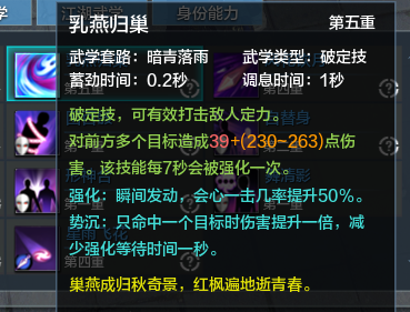 乳燕归巢:俗称大飞镖,大飞盘,手里剑,whatever,这个玩意在一测PVP是被我拖出快捷键的技能,2测摇身一变已经成为PVP最核心的技能之一。每7秒强化一次的特大手里剑不是盖的,这里就有一个需要多加练习的技巧了,你需要在战斗的同时关注你的buff栏