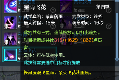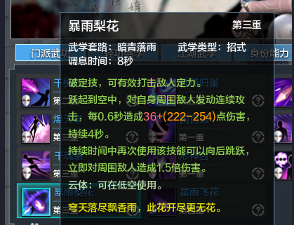 星雨飞花:一测中唐门此招伤害无耻的高(但能被翻滚躲避第三段伤害),2测已大幅削弱伤害。但仍然是唐门输出最高的技能CD较长,射程比风花吟月短5米,没开合的时候发动此招危险系数很好,最好接在强化手里剑击倒效果之后使用,一会介绍形神合的时候详细说。