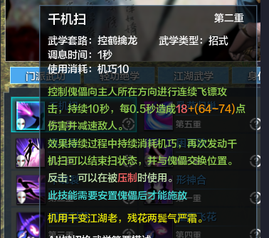 千机扫:唐门核心技巧来了,如果能用好就能非常 飘逸,发动扫的时候第二段是可以互换位置的,持续10秒CD也是10秒,最远30米,是一个超霸气的拉开距离技能,甚至你在被压制的时候都能换位置,目前 只有在浮空的时候不能换。听上去很美好,现实很残酷,首先傀儡需要裂在远处,然后再开扫之后,释放第二段前要等2秒,并不是瞬间就能换位的,如何把握好这 2秒的节奏,并且在这2秒尽量多输出敌人是每个唐门提升技术的必修课。而且你每多扫一秒就会损失一些机巧,当然有的敌人会很贱,你开扫他不上来,这时候你 还得及时裂出去来关掉扫,否则你的机巧每一秒都在流逝。