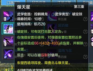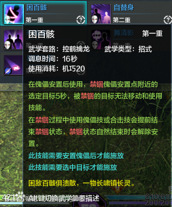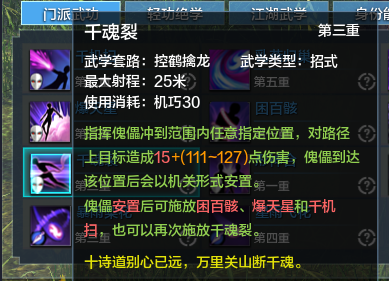 困:唐门核心控制技能,CD短于一般门派的脱离技,注意傀儡安置到合适位置,以便发动该招。进阶技巧:在放困控制的时候,在5S控制时间未到的 时候4.5秒的时候,完全看你对这个技能时长的理解,可以提前开扫,这时候能节省一个裂的机巧值,而且对方想冲过来近身的时候,你又可以飘逸的再换个位 置。你问我他不过来怎么办?继续揍他啊!