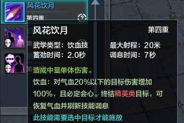 如果有左边那个buff的时候此时还处于强化阶段,不要贸然使用这招,因为会有0.2秒蓄力过程,这个空当已经足够对手接近了(每当手贱的时候 请默念200遍那句古老的告诫:“现有输出后有天,求生还在输出前”),当这个buff消失的时候说明强化已好,破定效果很好,对付破定的敌人还能击倒, 击退。实在是保持距离的不二神技。该技能没有CD,如果困住对手的时候,在前面说的风花吟月和星雨飞花CD的时候就拿这个丢对手吧。而且命中一个目标有伤 害加成并且减少强化等待时间。
