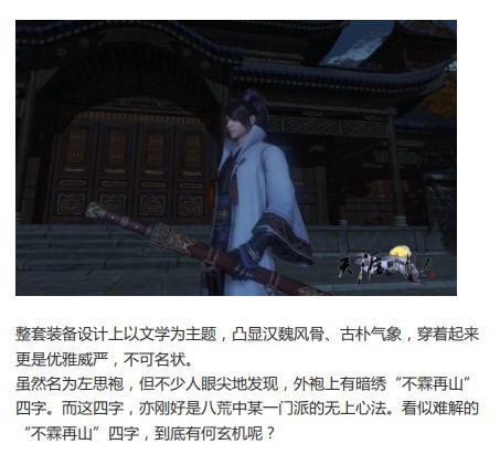 左思袍是通用套装中最高级的紫色装备之一。虽然名为左思袍,但不少人眼尖地发现,外袍上有暗绣“不霖再山”四字。而这四字,亦刚好是八荒中某一门派的无上心法。看似难解的“不霖再山”四字,到底有何玄机呢?