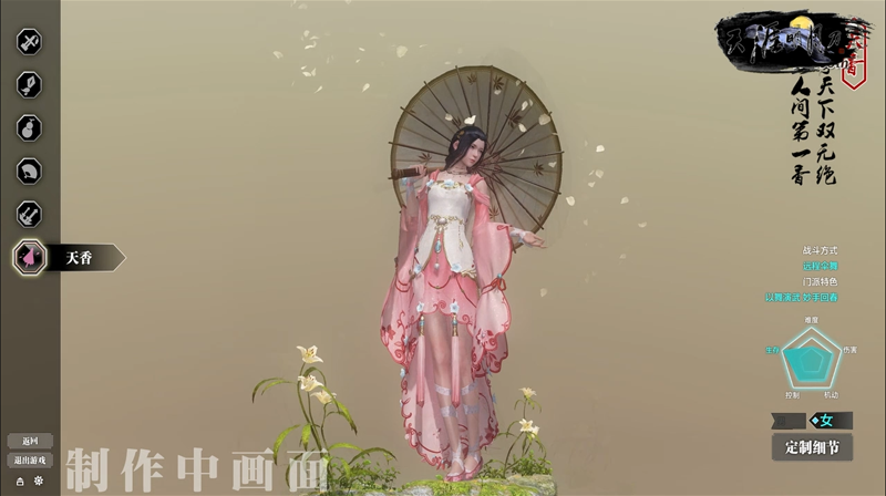 最后我们来看看撑着伞的婉约女子,视频里可以看到该女子站在花丛中,随风飘落的花瓣仿佛被吸引般的围绕在该女子身边,这就是天涯明月刀ol职业天香。 在我看来天香肯定会受妹子们的喜爱,当然我相信肯定有些男子也会喜欢的(什么样的男子,大家都懂的,这就不明说了)。在看看左的图标,上面画着伞,天香肯 定是使用伞来做为武器的。再看右边的介绍,远程伞舞,天香的战斗方式难道是跳着舞战斗的。这个大家可以去游戏里面体验就知道啦。