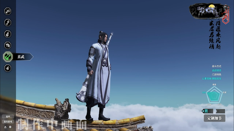接下来我们来看看这一身浩然正气的男子站在高耸入云的屋顶上眺望着远方,对,这就是天涯明月刀ol职业真武。左边的图标可以真武是使用双剑的,一大一小的剑。很多人看到下面的图肯定会说,说好的双剑呢,怎么就一把巨剑,快交出另一把小剑。这个嘛大家去看看视频就知道了,真武的小剑在大剑的旁边,图里是看不出的,大家可以去视频上看。