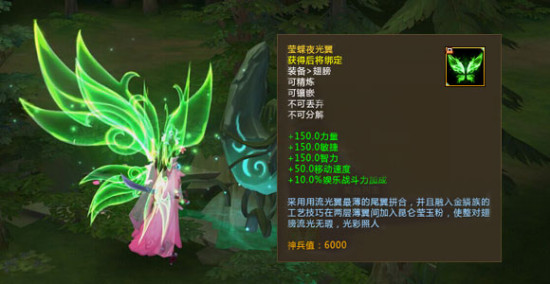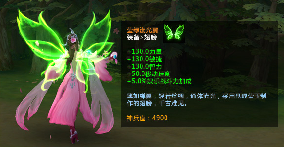 超级拉风的“萤蝶夜光翼”是由“萤绿流光翼”合成而来。极致奢华,女神必备。高达10%的娱乐战斗力加成,上分神器,每个人都值得拥有。