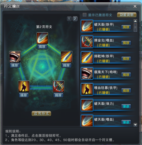 有了技能,作为《天之禁》最具有特色的符文系统自然必不可少,技能依靠不同的符文搭配才能发挥最大效果,比如,副本类的五铁甲系列符文,让沉香 加血 不再有压力,让高输出队友从不会担心被OT,野外PK常用的嗜血符文和控场符文套装,搭配力攻血会心系列的装备属性,同样有着不一样的表现,简直闪瞎所有 玩家的双目——谁说神将就是炮灰来着?!