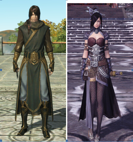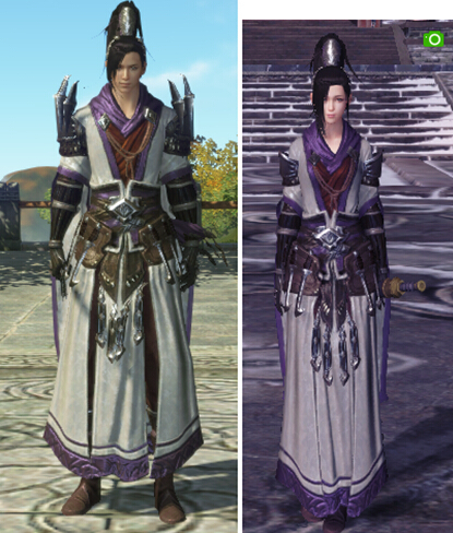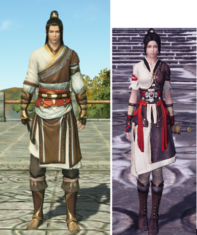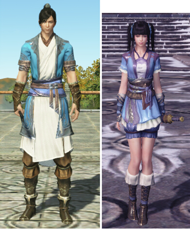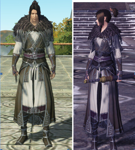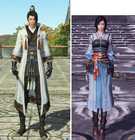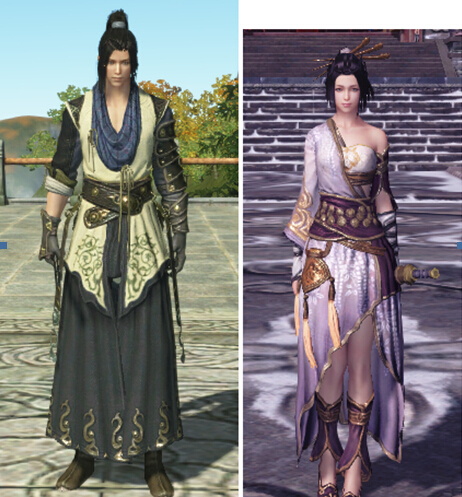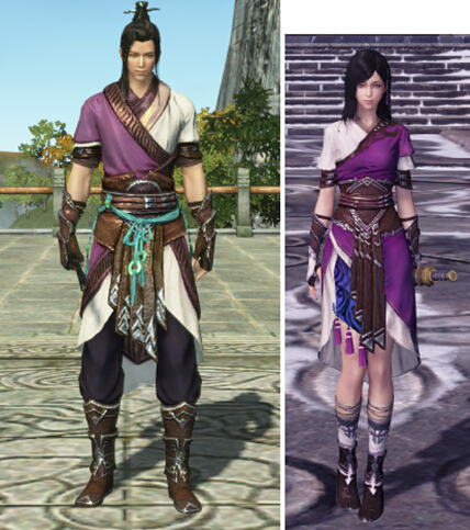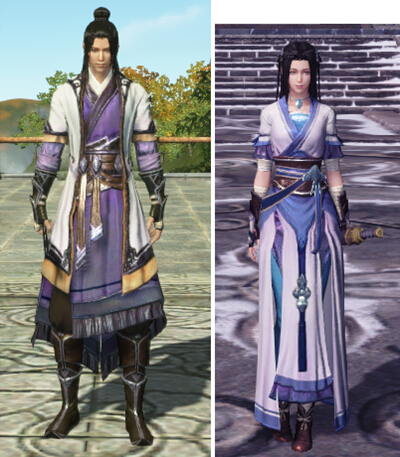 一片肃杀的密林,一位大侠手握染血长剑,身着紫边白袍,这就是迷倒万千少女侠的男神必备套装,高马尾完全没有抵抗力。女装温和很多,不过也带着一股扑面而来的女侠气息。