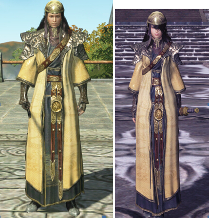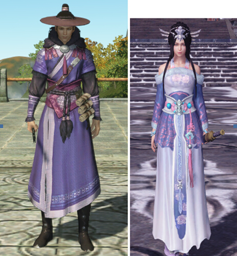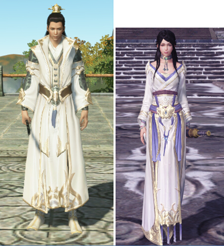 这套不管男款还是女款,都大爱。男款白衣翩翩浊世佳公子,另外土豪金的镶边唐门角色特别搭配;女款运用紫色和金色镶边,领口香肩微露,雍容华贵不二之选。