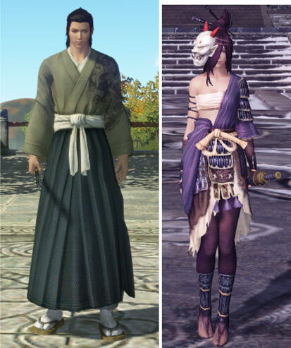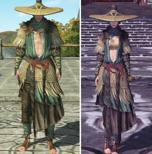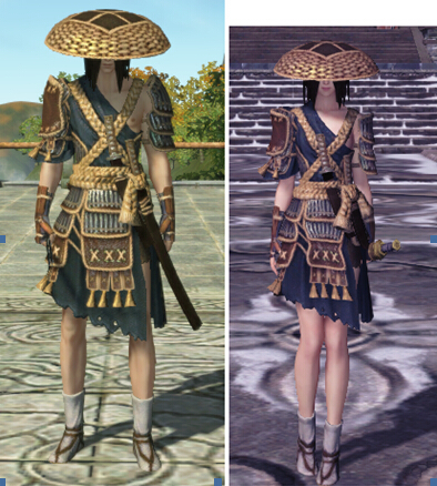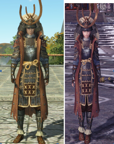 天刀时装中还包含两款基于日本武士盔甲风格的外观,异国风情也是很有特点的。