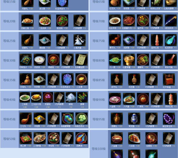 100级:加血食物八宝酱*20,加蓝食物八珍钱*20,龙烟祝*50,5万两银票*1,皆空紫净瓶*3,瞬加红药藕节丸*20,瞬加蓝药黄精散*20