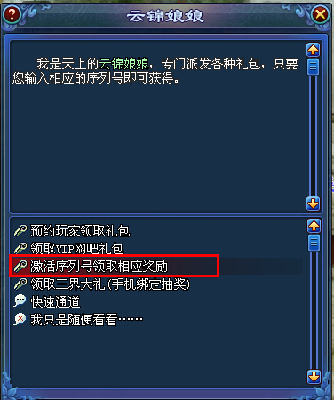①进入游戏后,对话NPC“云锦娘娘”(蒲家村,188,154),点击“激活序列号领取相应奖励”选项 ;