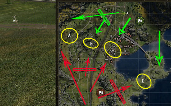 红色与绿色箭头为双方进攻区域,红色与绿色方框为反坦克防守区域,黄色圆圈为战斗爆发场所