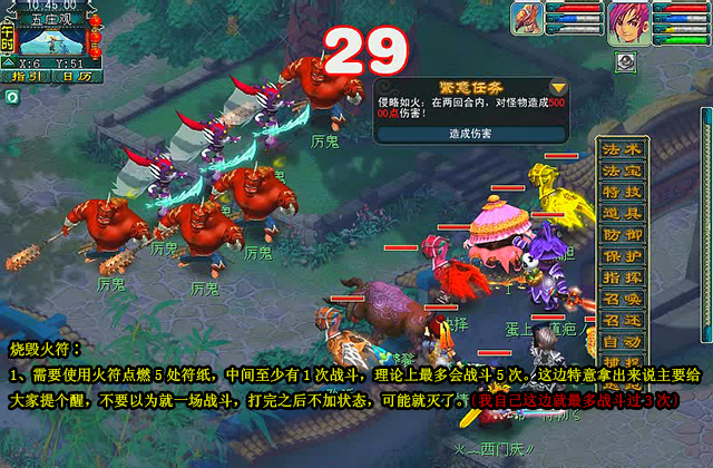 1、需要使用火符点燃5处符纸,中间至少有1次战斗,理论上最多会战斗5次。这边特意拿出来说主要给大家提个醒,不要以为就一场战斗,打完之后不加状态,可能就灭了〔我自己这边就最多战斗过3次〕 。